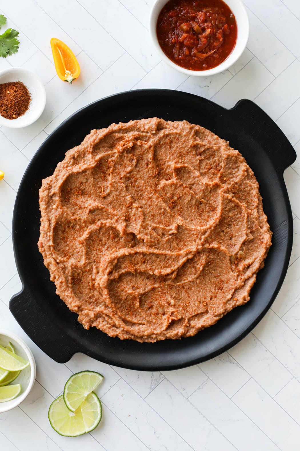 – used two cans of refried beans (Siete brand ranchero refried beans and Siete brand refried pinto beans)