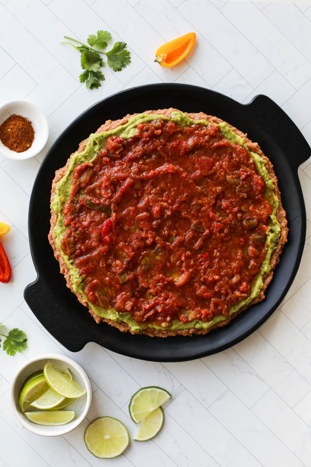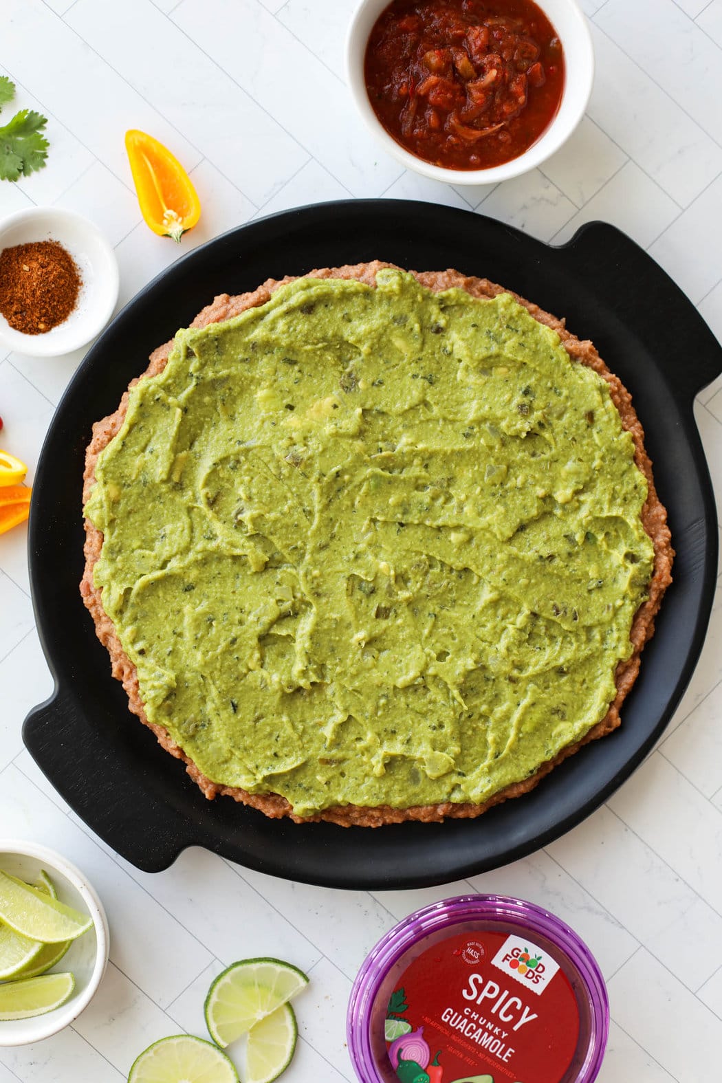 2. Spread the guacamole over the refined beans layer.