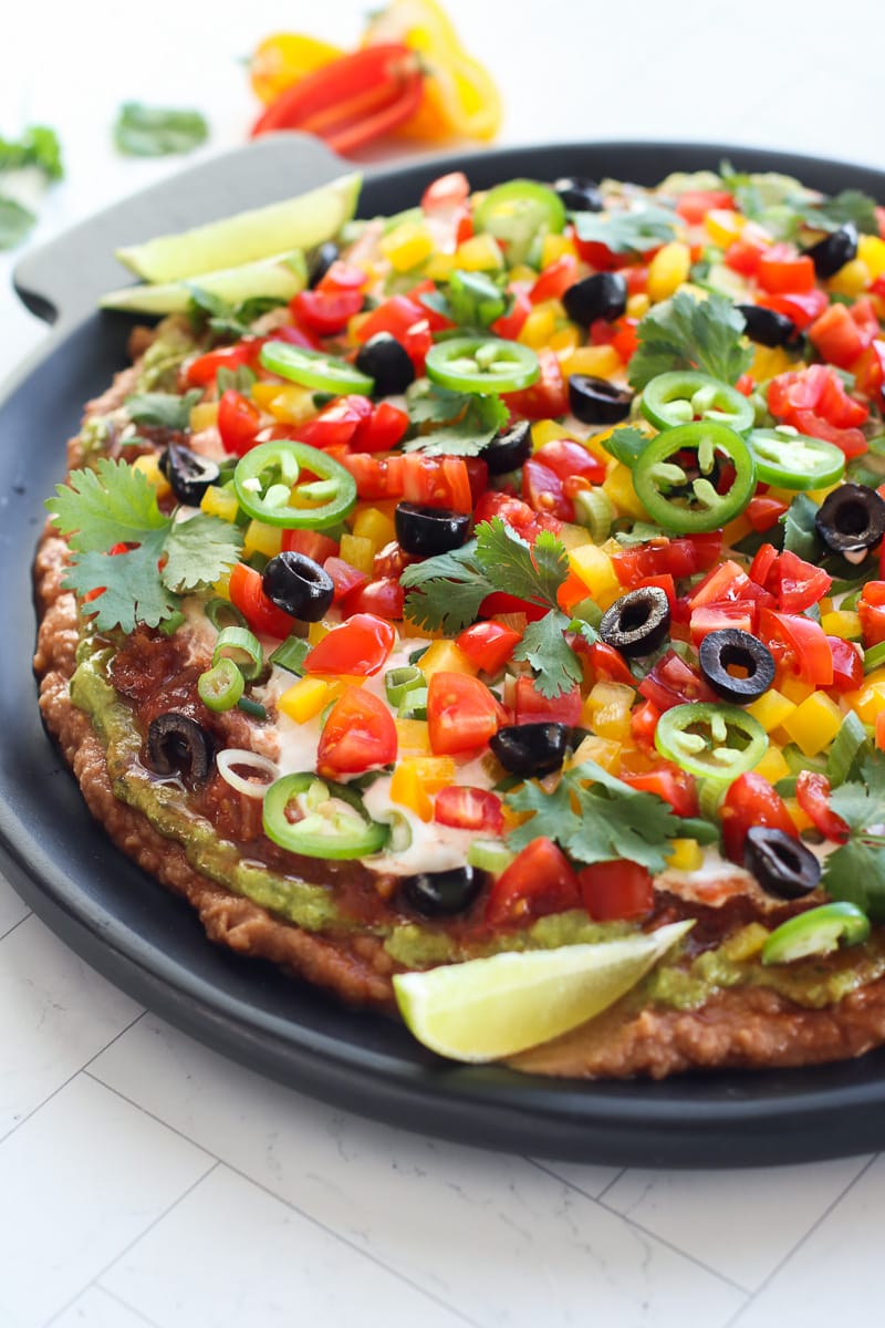 - refried beans – use any brand of refried pinto beans or refried black beans for the base layer