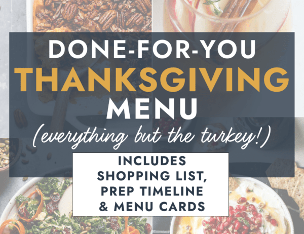 We’re here to help you navigate this special holiday with a done-for-you Thanksgiving menu. It includes a grocery list, 7 recipes, a prep time guideline, plus printable menu cards.
