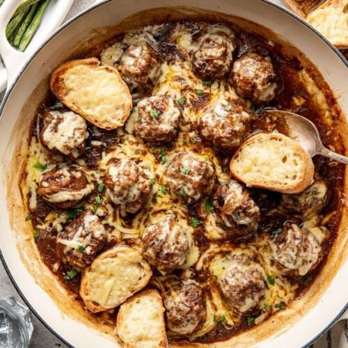 I use my favorite enamel-coated large cast iron skillet, which is oven safe. Using a large skillet (12 inches round or larger) ensures all the ingredients fit comfortably without bubbling over. I like cast-iron because it heats evenly, holds its temperature well, and can go straight from the stovetop to the oven without any issues. If cast-iron isn’t an option, use a 12-inch or larger, stainless steel skillet with a heavy bottom.