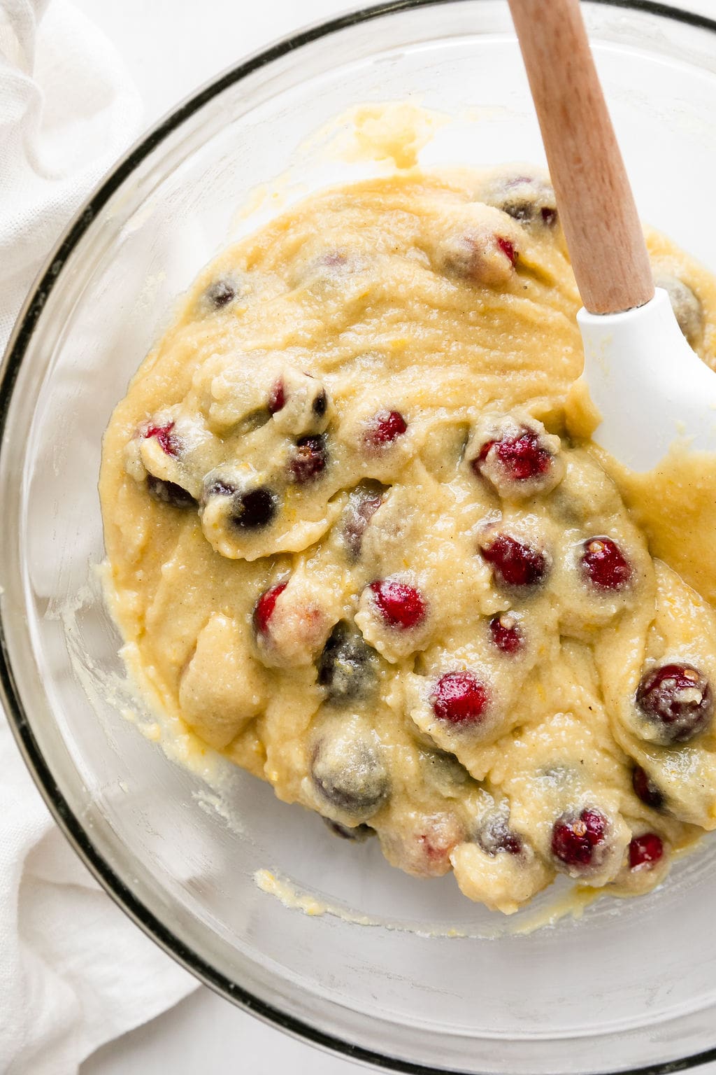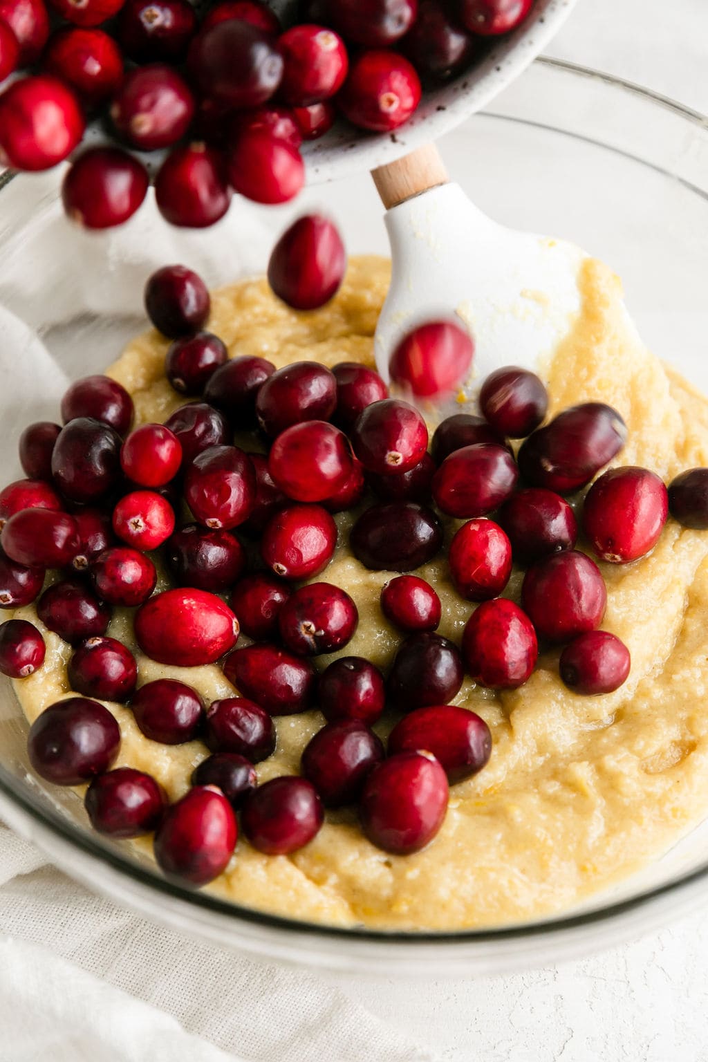 - Fold the orange juice, zest and cranberries into the batter.