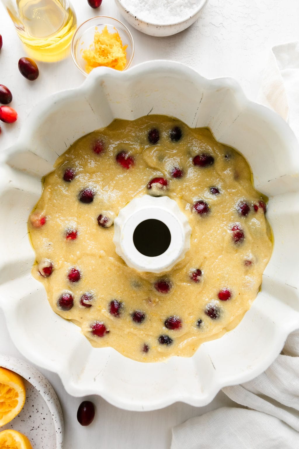- Fold in the fresh cranberries. Pour the batter into the prepared bundt pan and smooth the batter with a spatula to evenly fill the pan.