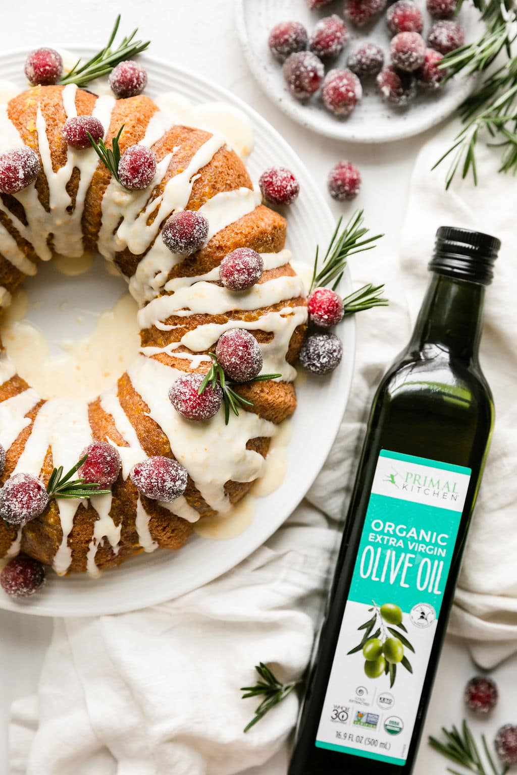 - Drizzle the glaze over the completely cooled cake and garnish with sugared cranberries and fresh rosemary just before serving, if desired.