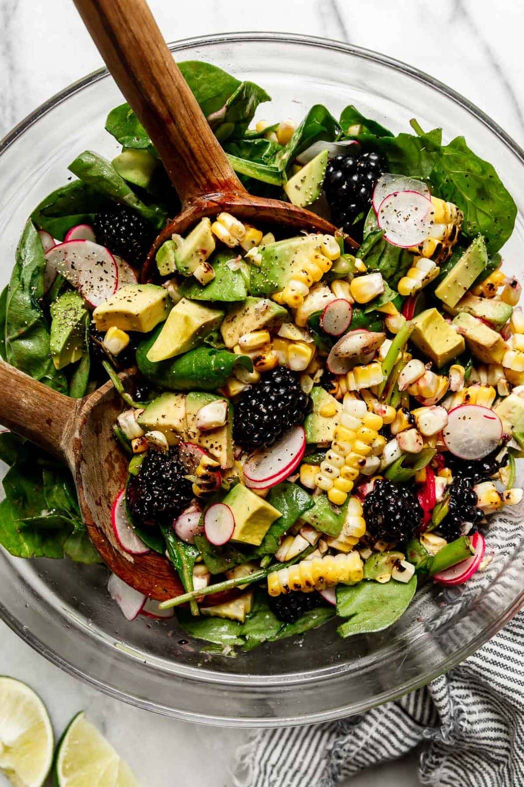 - In a medium bowl, gently toss together arugula, radishes, blackberries, avocado, green onions, and corn kernels. Just before serving, drizzle vinaigrette over salad and toss until incorporated.