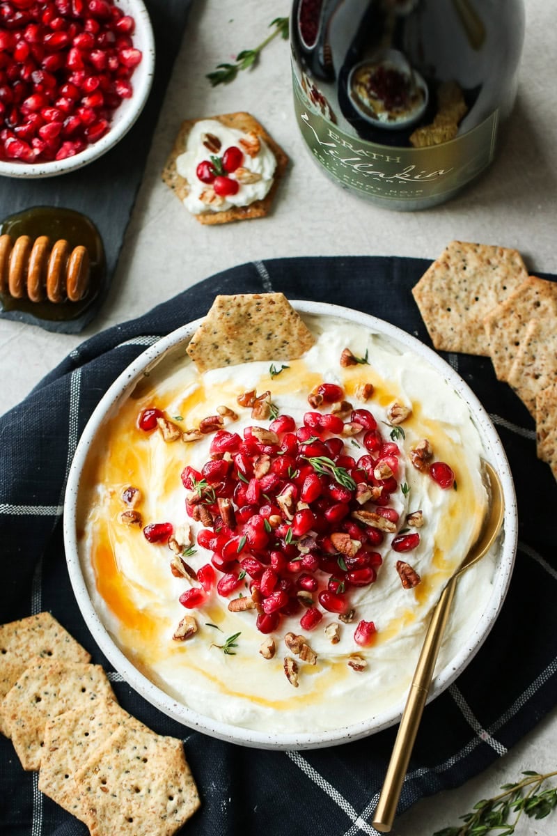 - Pomegranate seeds – adds a burst of fruity flavor to the whipped goat cheese and makes for a pretty presentation that fits the Holiday theme.