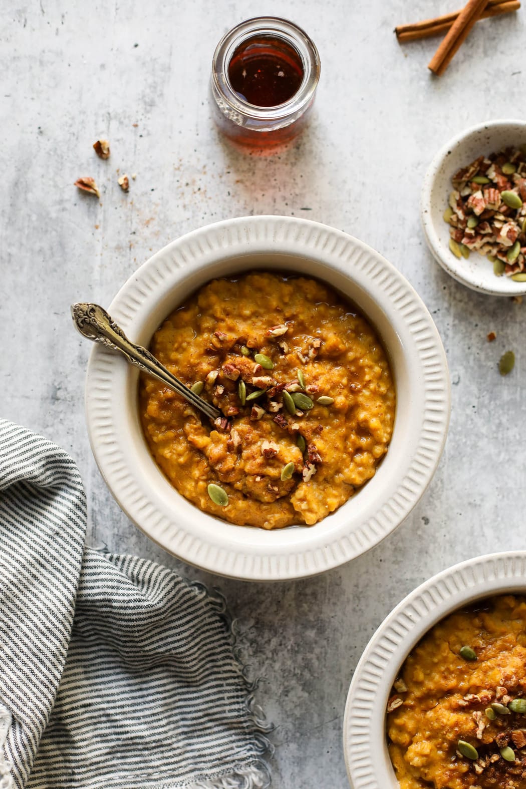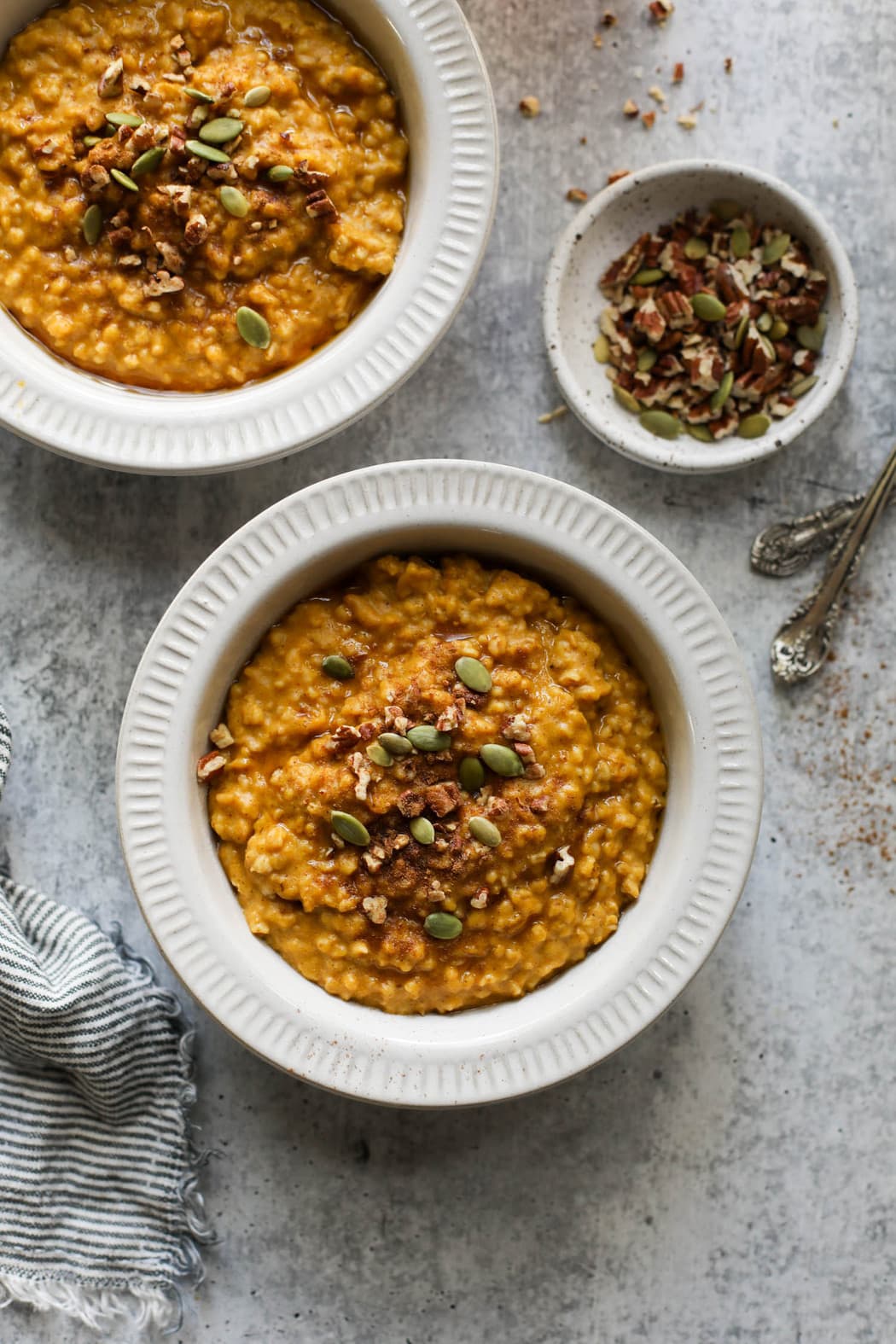 Use certified gluten-free steel-cut oats, if needed. To make this pumpkin oatmeal recipe dairy-free and vegan, use your favorite non-dairy milk.