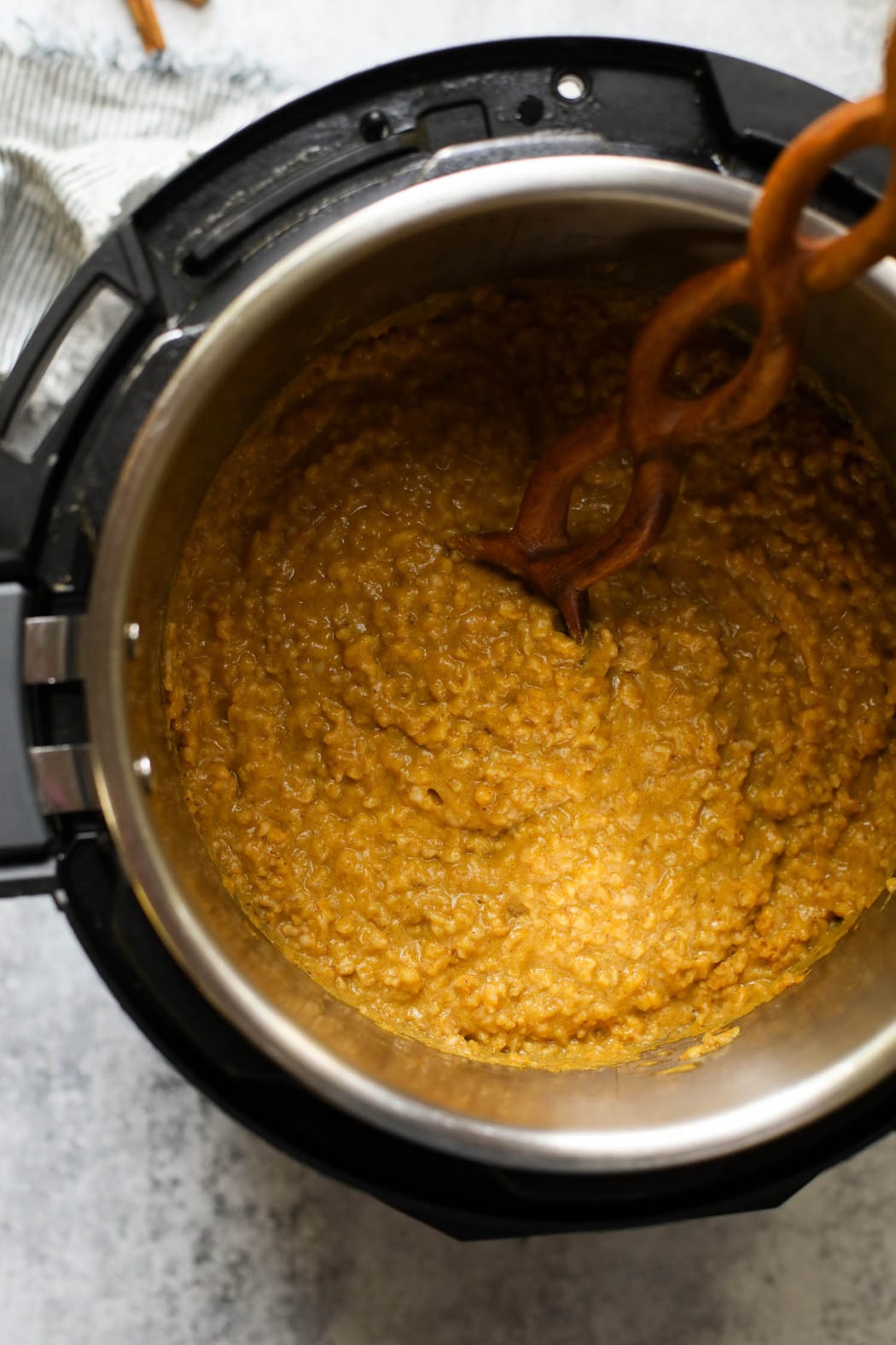 - Combine the oats, milk, water, pumpkin, maple syrup, pumpkin pie spice, cinnamon, and salt in an Instant Pot; stir well.