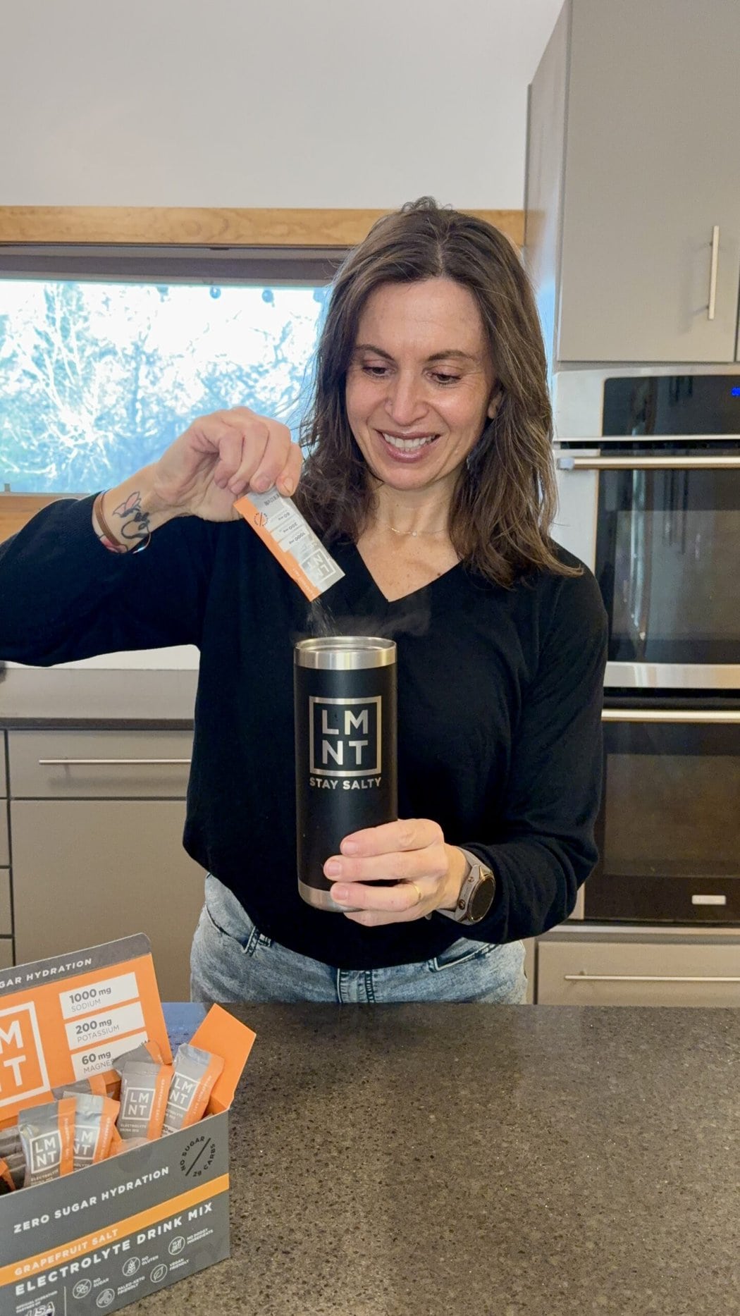 - How she uses LMNT: Stacie included even more LMNT in her daily routine when she was breastfeeding, adding a full packet to 64 ounces of water, which she sipped throughout the day. Now, post-breastfeeding, she’ll use a half packet on most days or a full packet on days when she gets in a big sweat session.