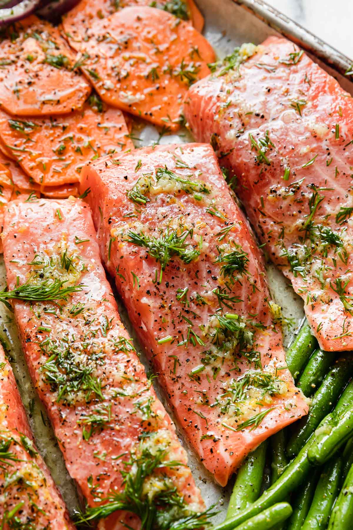 In this sheet pan salmon recipe, we call for a simple combination of olive oil (you can use extra-virgin olive oil or avocado oil), lemon juice, garlic, dill (use fresh or dried), salt, and pepper. These citrus-herb flavors pair well with the richness of salmon. Once the marinade is mixed, set aside 2 tablespoons of it, which you’ll use to toss with the onion and green beans. Then, the remaining marinade gets divided in half (half to marinate the salmon and half to marinate the sweet potatoes).