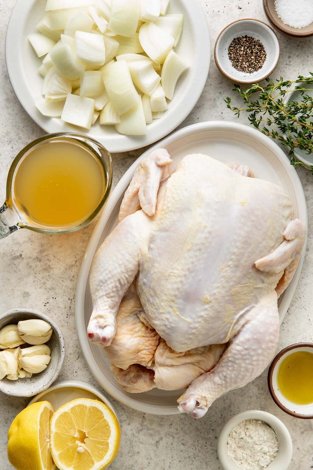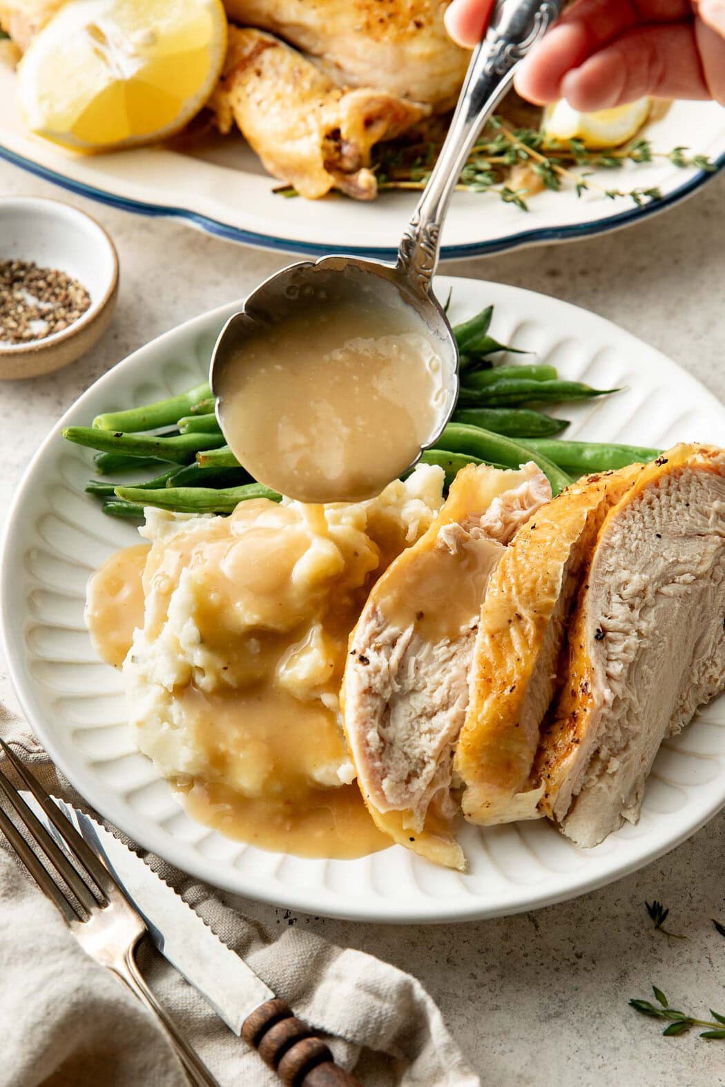 - Chicken broth: This adds moisture to the pan and helps create flavorful drippings for the gravy. Homemade bone broth or store-bought chicken broth will produce a richer, more savory result, but water also works just fine. If using store-bought chicken stock or broth, I choose a low-sodium option to prevent the chicken and gravy from tasting too salty.