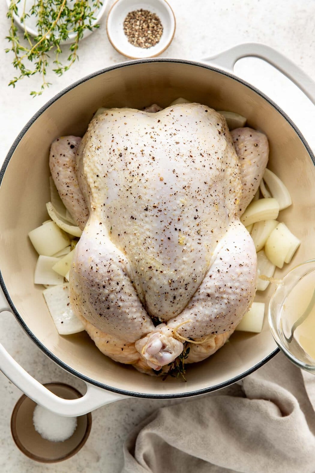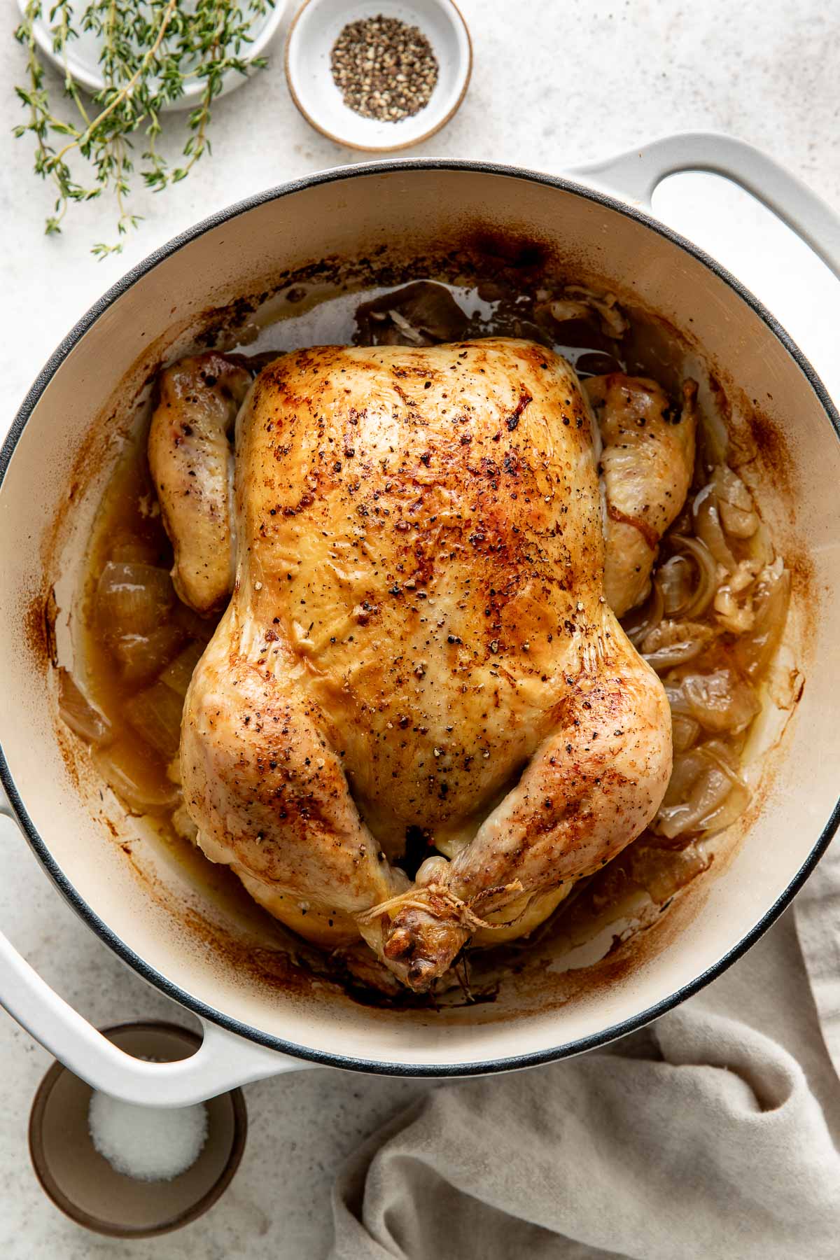 - Yellow onion: Roasting the chicken over onion chunks adds natural sweetness and depth of flavor. As they cook, the onions caramelize in the drippings, creating incredibly tender, flavorful bites. Choose a firm onion with no soft spots or sprouting.
