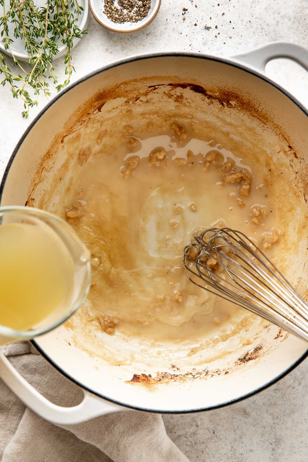 - Prepare the gravy: While the chicken rests, I pour the pan drippings into a small measuring cup and let them cool slightly. Once the fat and drippings separate, I spoon some of the fat from the top and warm it in a pan over medium heat. Once hot, I sprinkle flour over the drippings and whisk until a thick paste-like mixture forms, and continue whisking until the flour is golden brown. Then, I slowly add the broth, whisking constantly, and cook until the gravy thickens.
