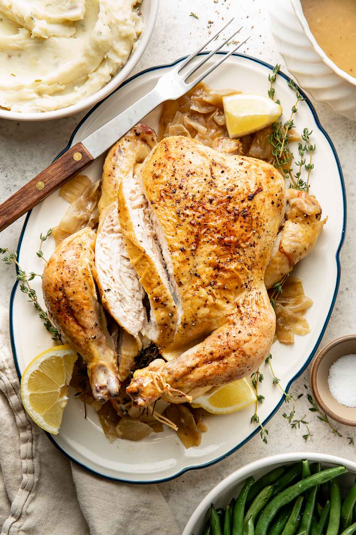 If I can resist eating all the onions, I like to carve the baked chicken and serve it on a large platter with the roasted onions and garlic spooned right on top. Then I drizzle everything with a little of the pan juices or gravy for a simple meal that feels elevated.