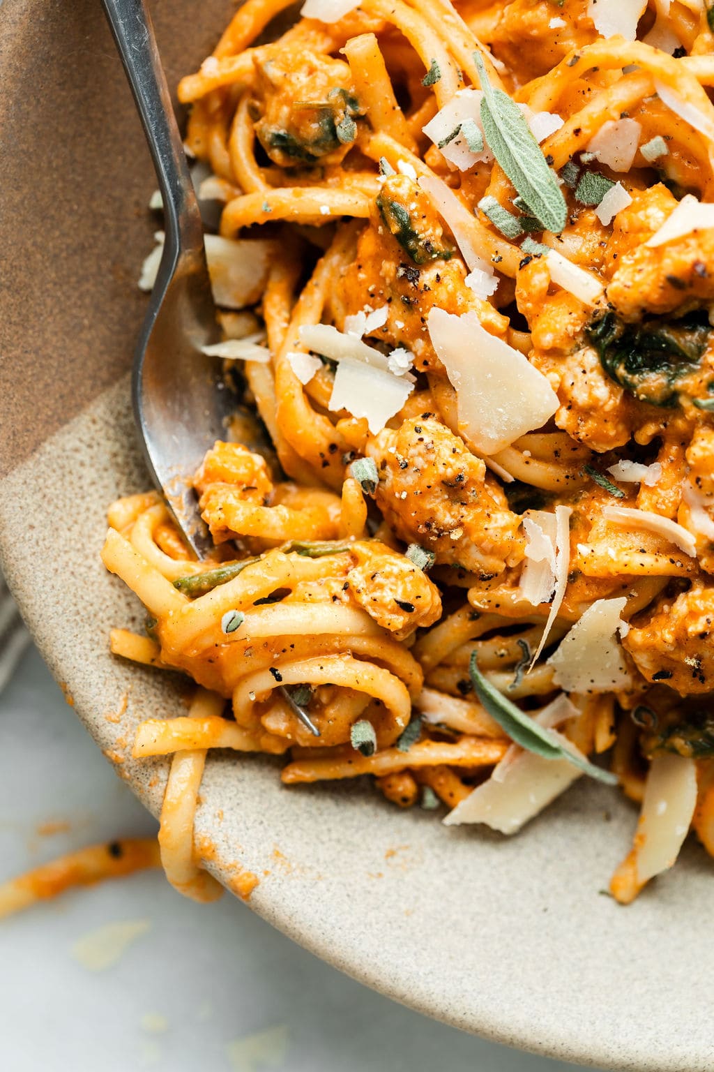 This Creamy Pumpkin Pasta with Sausage and Sage feels like something you’d order at a fancy restaurant. So you’ll be surprised to learn that it comes together in one skillet with minimal prep time and a total time of just 30 minutes.