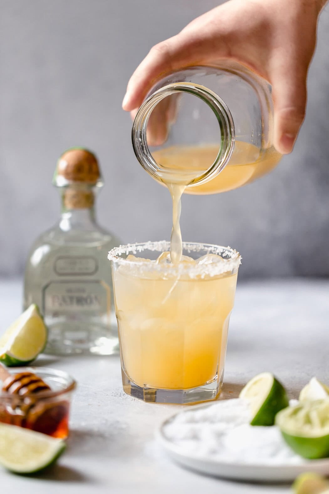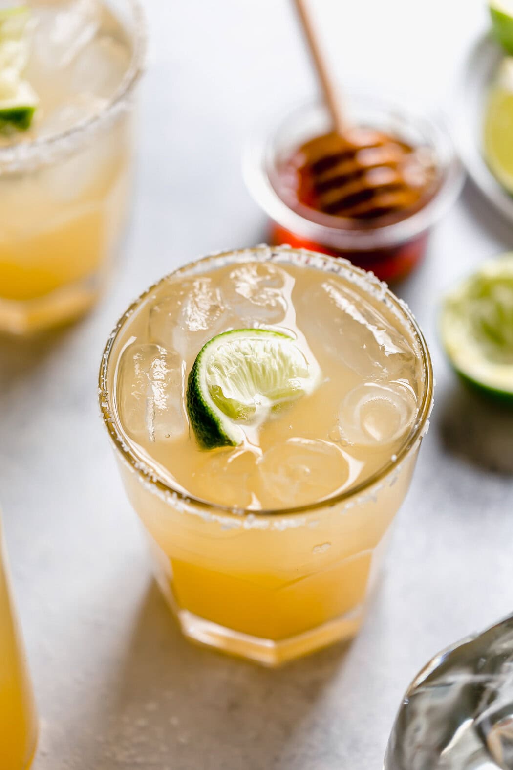 To make these margaritas vegan-friendly, I substitute agave syrup or agave nectar for the honey called for in my recipe. It’s a super easy swap, and I’ll still end up with sweet and citrusy margs!