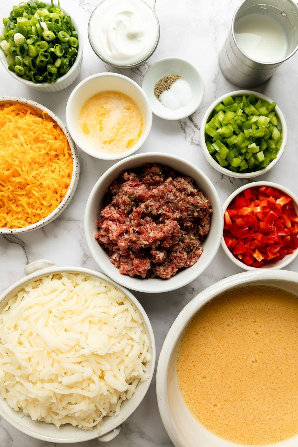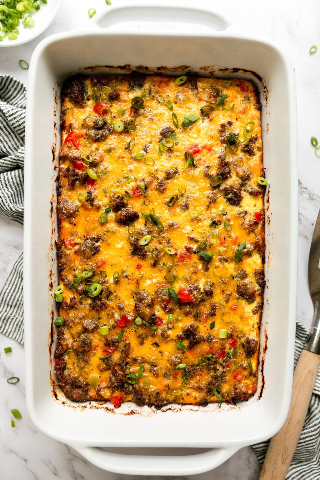 Overnight instructions: follow the recipe through step 5. Allow the hash browns and sausage mixture to cool for at least 30 minutes so that the eggs don’t start to cook when added to the dish and set overnight. Once cooled, pour egg mixture over the hash browns and sausage mixture. Cover and refrigerate overnight. When ready to bake, remove the dish from the refrigerator, uncover, and continue on with step 7. You may need to add an additional 5 minutes. To ensure the dish is cool enough, you could also wait to pour the eggs into the dish until just before baking. Store the egg mixture, covered, in the fridge overnight. When ready to make the egg bake, simply pour the egg mixture over the hash browns and sausage and bake.