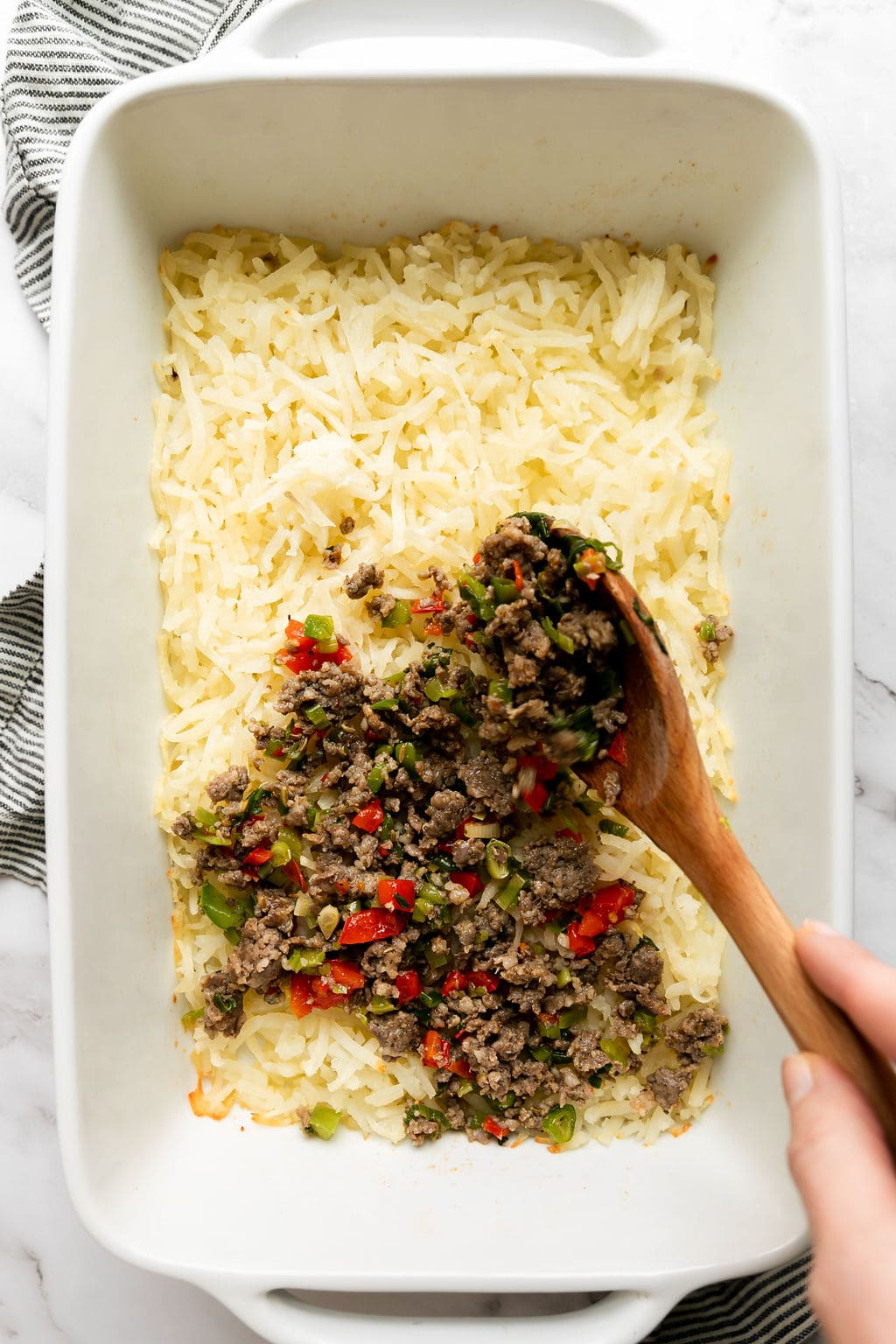 - After the hash browns come out of the oven and the sausage mixture is added, make sure to allow everything to cool before adding the eggs. If you add the eggs and the hash brown and sausage are too hot, the eggs will start to bake.