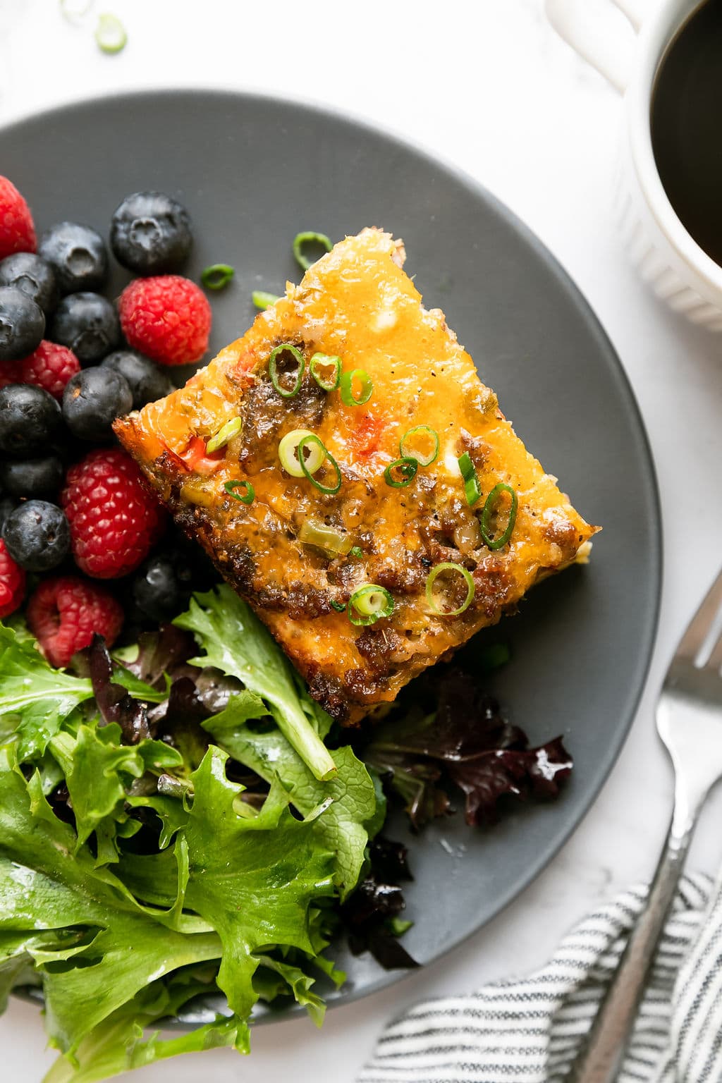 This easy and delicious Sausage Egg Bake is a dish the whole family will love! You can serve it up for breakfast, brunch or even dinner because everyone loves breakfast for dinner! Every bite of this breakfast casserole is full of flavor and complete with the perfect amount of sausage, hash browns, peppers, and cheese (if you please). You’ll also love the fact that you can whip this egg bake up the night before, let it sit overnight in the fridge, and bake it in the morning. Serve it with some fresh fruit for a tasty, satisfying, and healthy breakfast for any day of the week or for an Easter or Christmas morning brunch. Also, great for meal prep and reheating throughout the week.