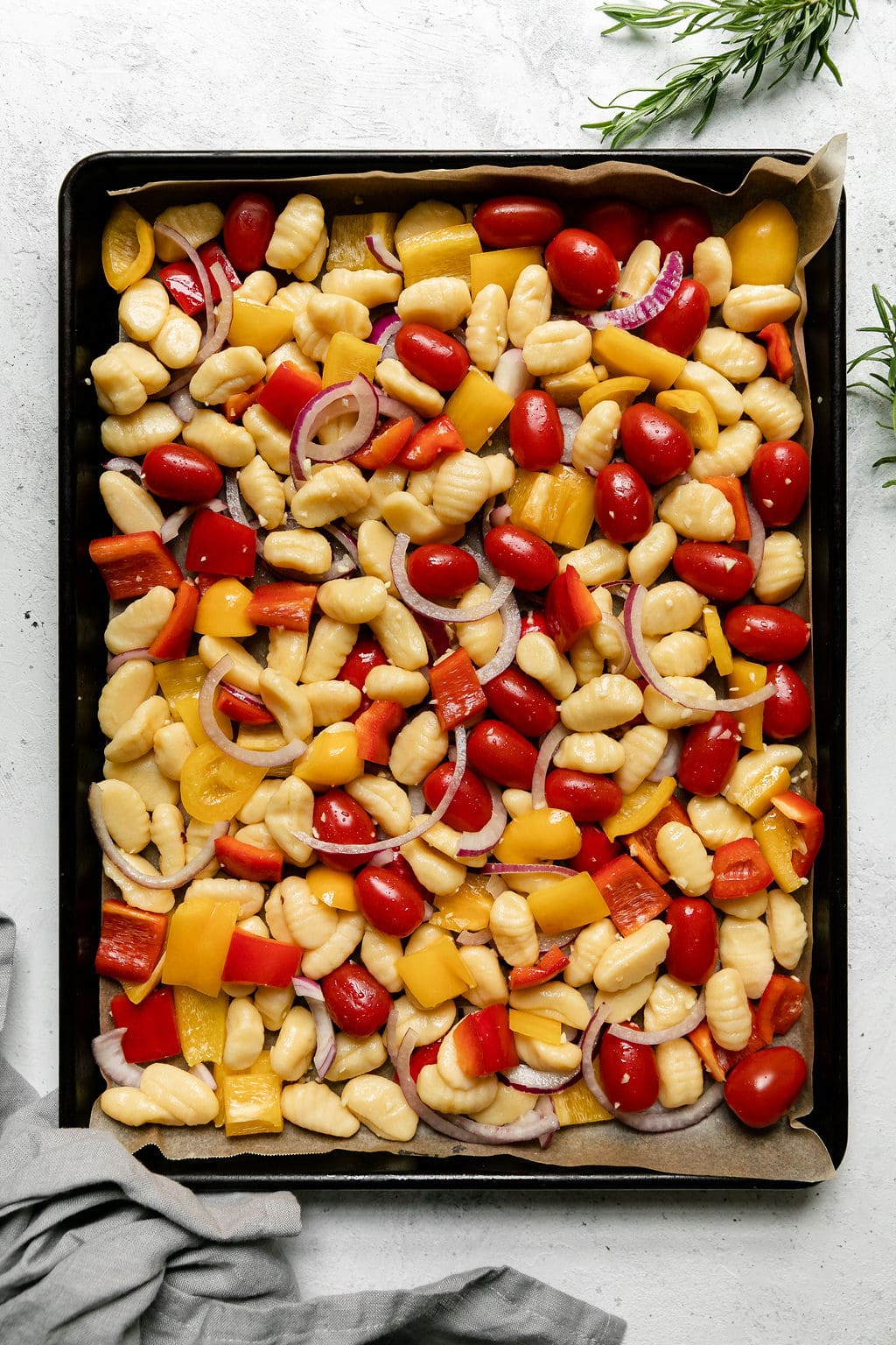 - Place the gnocchi (do not thaw if using frozen gnocchi), peppers, onions, tomatoes, and garlic on the baking sheet. If using dried rosemary and/or basil, add those to the pan now. Drizzle with olive oil and toss to coat.