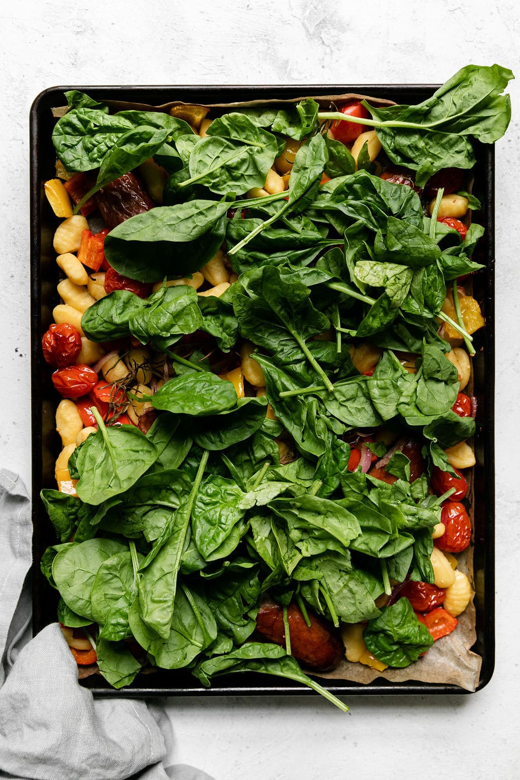 When it comes time to cook, simply add the vegetable mixture to the pan along with the gnocchi (do not thaw the gnocchi if using frozen), tomatoes, and olive oil, tossing to coat. Then place the kielbasa on top and bake. Reserve the spinach, fresh basil, and Parmesan cheese to add later.