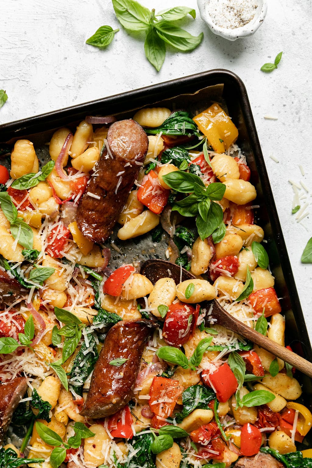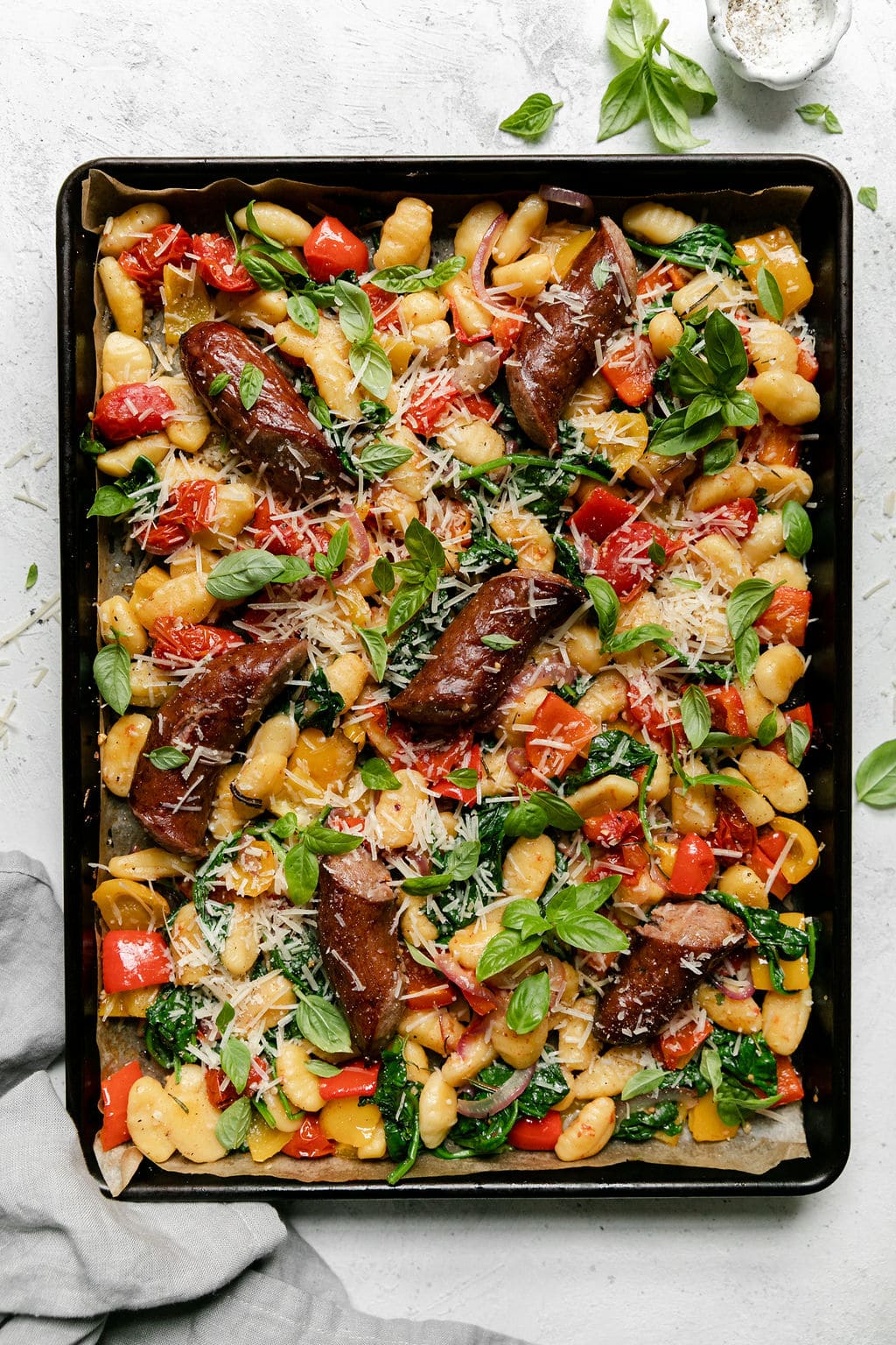 Sheet pan meals are ideal for busy weeknights because everything goes on one pan leaving you fewer dishes to wash. This sheet pan gnocchi meal features colorful peppers, onions, tomatoes, and spinach that not only makes a feast for the belly, but it’s also beautiful on the plate.