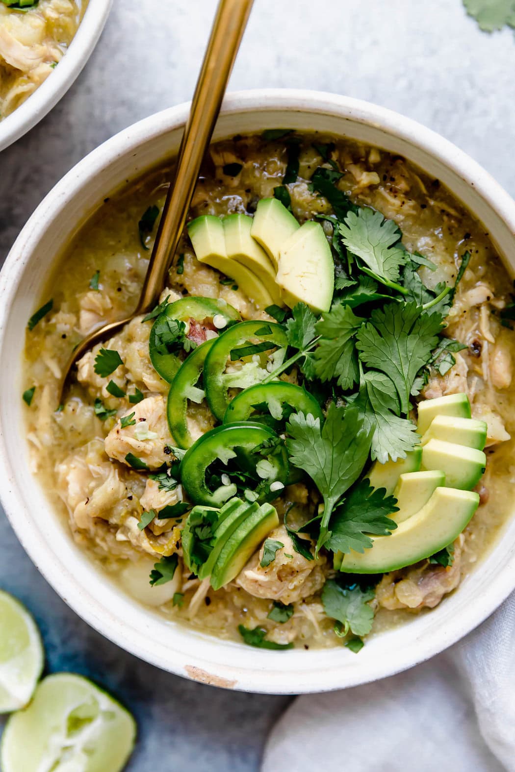 Don’t be shy with those toppings. I have yet to meet a slow cooker meal that didn’t benefit from a judicious application of fresh and tasty toppings. For this Slow Cooker Chicken Chile Verde Stew I highly suggest the following: