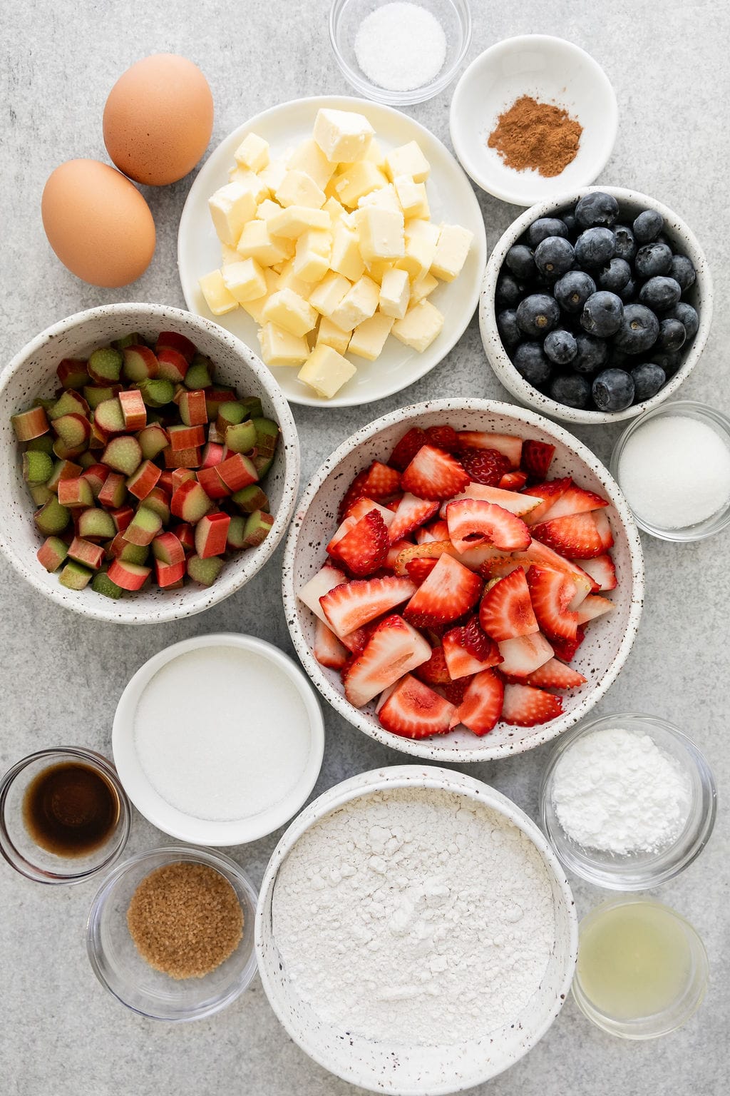 - Rhubarb – fresh rhubarb that’s diced small. If you don’t have rhubarb, you can substitute additional berries.