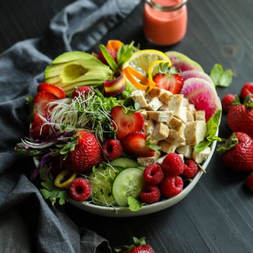 - Spinach: I use baby spinach since it has a tender texture and a mild flavor that pairs well with the fresh berries. Arugula, chopped romaine, or any favorite lettuce greens will work.