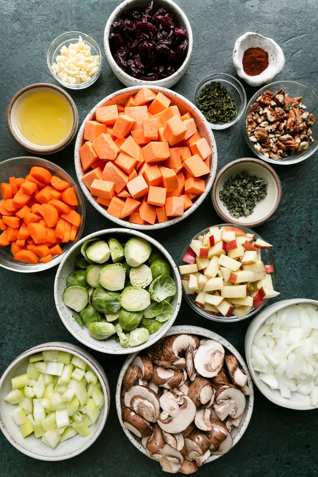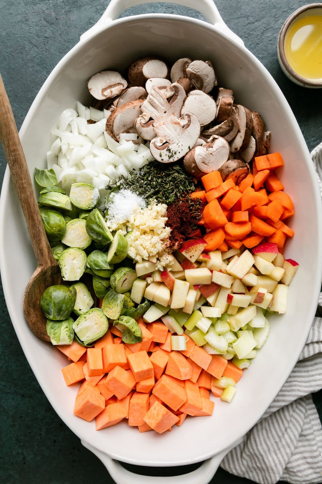 - Full of nutritious ingredients, including sweet potatoes, Brussels Sprouts, carrots, mushrooms, apples, and nuts
