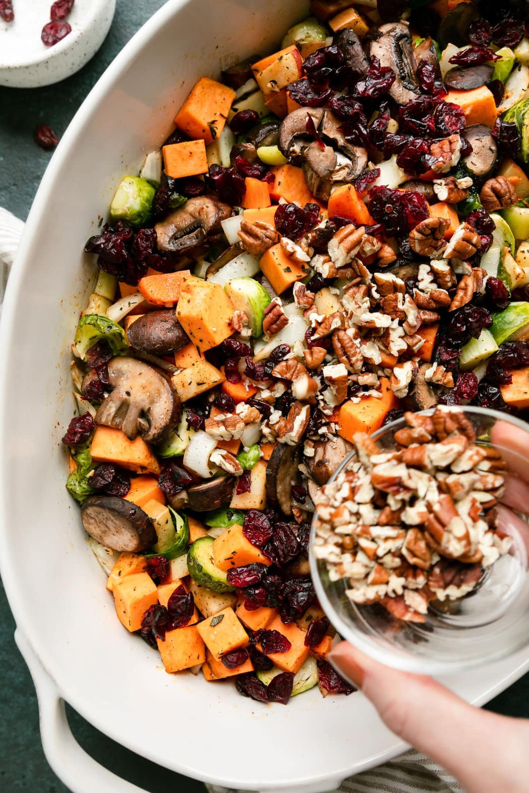 - Combine all of the ingredients (except for dried cherries and pecans) in a large baking dish (9×13 or similar size). Toss with oil. Cover with foil.