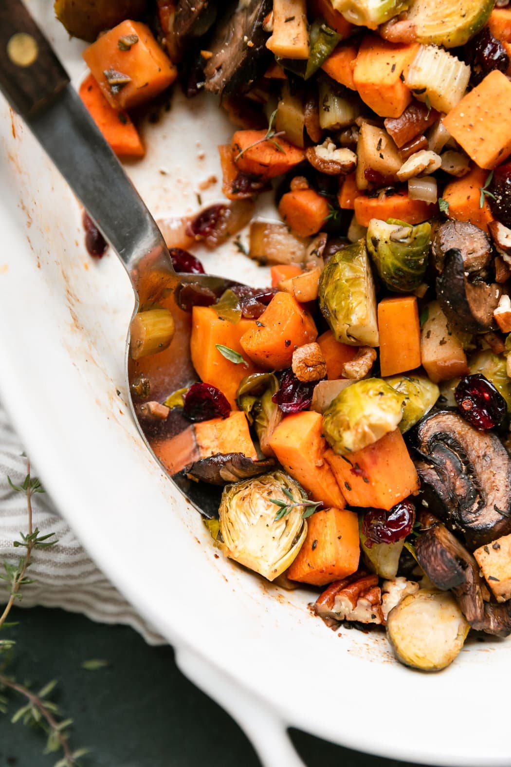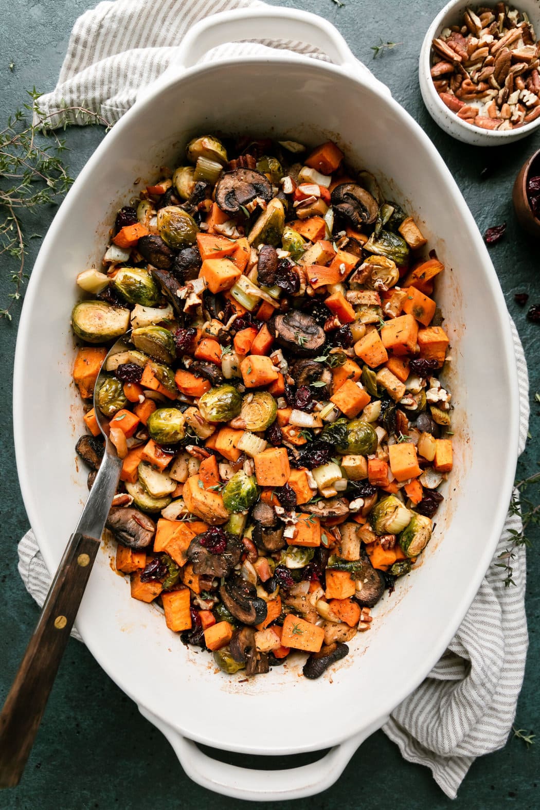 If you love stuffing but are looking for something a little different from the norm, possibly a stuffing made without bread, or a stuffing option that you can serve to guests who may eat gluten free, dairy free, and/or vegan, then this is it! Your Thanksgiving table is about to get even more delicious with this colorful and delicious Sweet Potato Stuffing. It comes together with a variety of winter vegetables, toasted pecans, dried cherries, apples, mushrooms, and herbs that represent the flavor of stuffing that we all love. This unique take on stuffing is perfect if you’re looking for a lighter side-dish option to serve, a vegetable heavy side dish, or simply something new and fun to try.