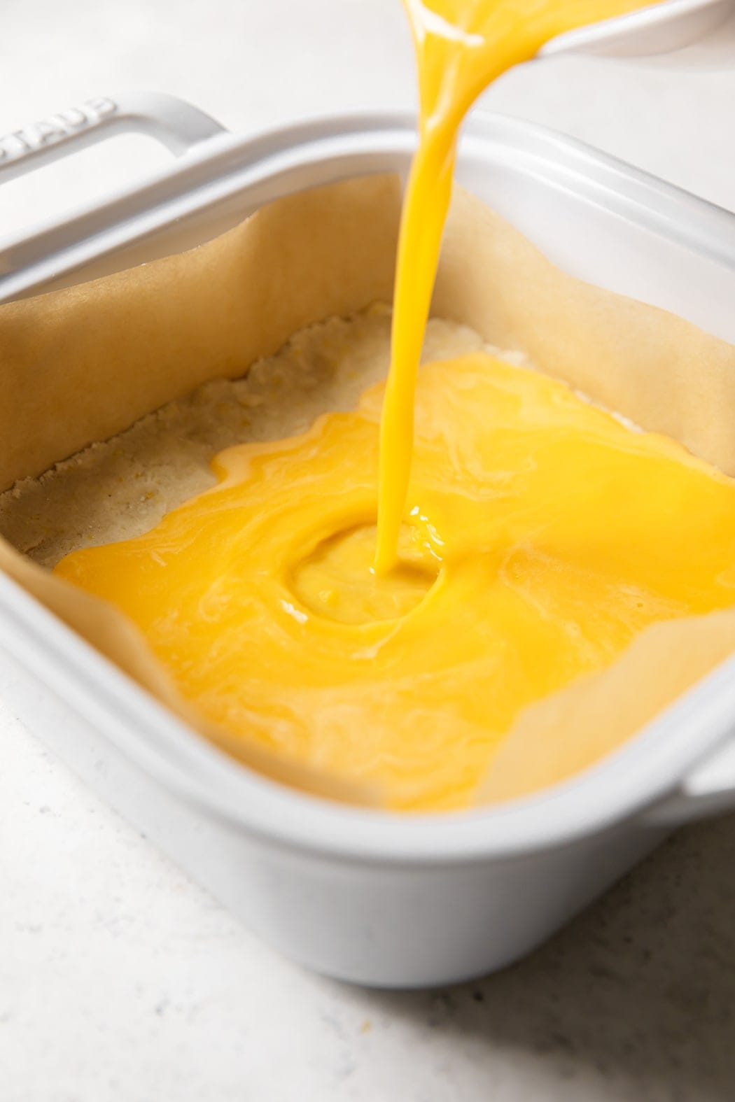 Bake the crust for 5 minutes, just enough time for it to start to set before you add the lemon filling. The filling is made by mixing eggs, sugar, lemon juice, cornstarch, and lemon zest. Pour this filling over the par-baked crust and then return it all to the oven for 30 minutes.