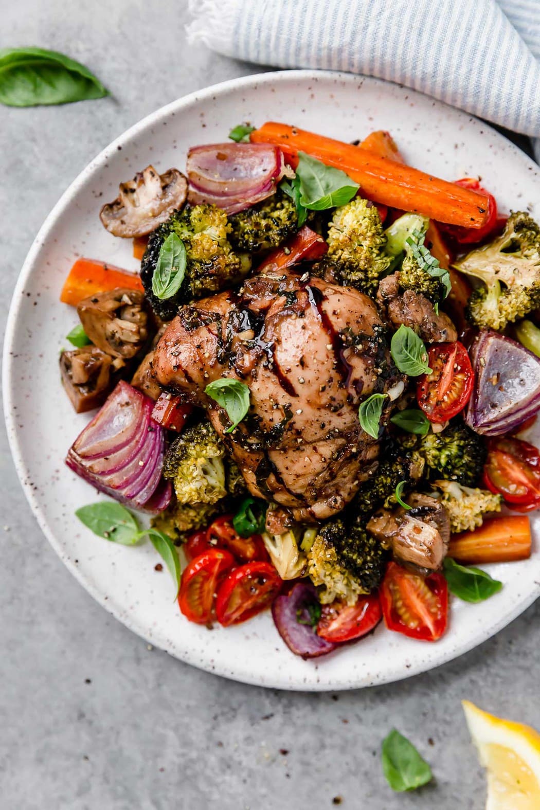 + balsamic vinegar + avocado oil + garlic + dijon mustard + fresh basil + salt & pepper + chicken breasts or thighs + broccoli + carrots + mushrooms + red onion + cherry tomatoes