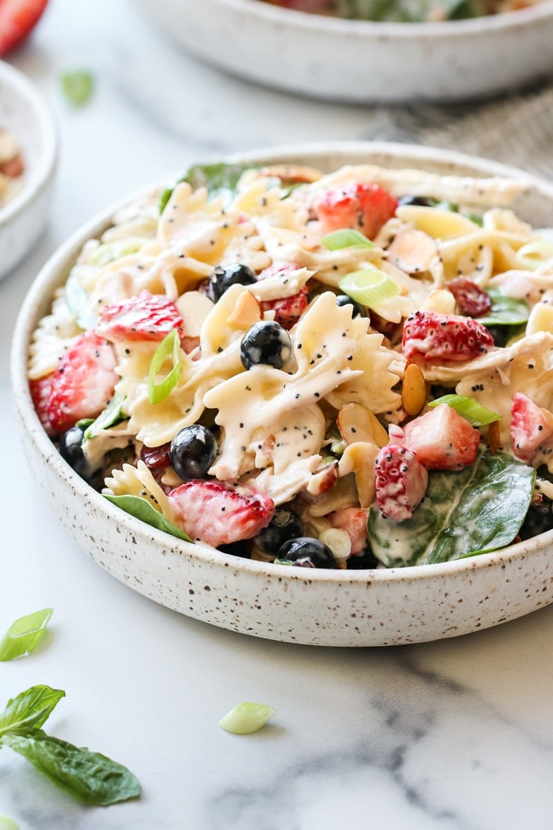 Bow tie pasta, tender chicken, sweet berries, fresh basil, toasted almonds, and baby spinach are tossed together in a honey poppy seed dressing for a delicious pasta salad to serve for lunch.